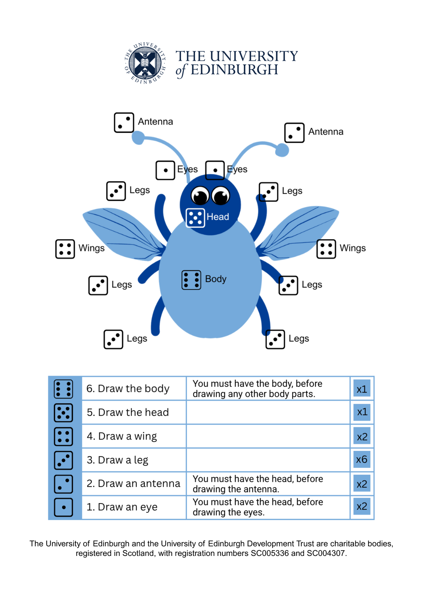 Beetle Drive Throw a six to start!Thank you for hosting a fundraising Beetle Drive. The goal of Beetle is to be the first player to draw a complete beetle and score points based on the parts drawn. The game is played in rounds, and the player with the highest total score at the end wins.Each player will need:Dice - Either one dice per player or one per teamScore sheets - Download here (or plain paper will suffice!)Pens / pencils - A pen or pencil for each playerBeetle template - Download hereSetupIdeally, gather 4 to 6 players at each table. Each player receives a score sheet and a pencil. The team usually share a dice, but it can be played with a dice each. The youngest player starts the game by rolling the dice first, and play continues clockwise.Rolling the DicePlayers take turns rolling the dice and drawing parts of the beetle based on the number rolled. Each player must roll a six to start.Shouting 'BEETLE!'The first player to complete their beetle shouts "BEETLE!" and the round ends. All players then count their drawn parts and score 1 point for each part completed.ScoringThe player who completed their beetle scores the maximum points for that round (14 points if all parts are drawn). Other players score based on the number of parts they have drawn.Moving TablesAfter each round, players may move to a different table to play with new opponents, adding a social element to the game.The person with the highest score moves clockwise. The person with the lowest score moves anti-clockwise. If two people on the table have the same highest or lowest score, then the youngest person moves.Winning the GameAfter a predetermined number of rounds, players total their scores. The player with the highest score wins. In case of a tie, tied players can roll the die, and the highest number wins. JustGivingYou might have friends and family who would like to support your fundraiser, but can't make it along to your Beetle Drive. It's a good idea to set-up a JustGiving page (at www.justgiving.com/charity/universityofedinburgh) ahead of your event and let them know they can donate through your JustGiving page.Step 1: Add your photo to let your friends and family know they’re at the right pageStep 2: Use your story to let your supporters know why you’re fundraisingStep 3: Set an ambitious fundraising targetWhen creating your page, JustGiving will automatically generate a unique URL; it’s worthwhile changing this to something easy to remember. And please opt-in to receive keep in touch with your chosen charity (that’s us) when completing your page.MATCHED GIVINGSome companies (big and small) support their employees fundraising efforts through matched funding. Ask your employer if they offer matched funding (or similar).GETTING YOUR MONEY TO USIf you have set up a JustGiving page for online donations and collected cash as part of your fundraising, simply bank the cash and pay the donation into your JustGiving page. You can also donate online, via bank transfer or by cheque – email fundraise@ed.ac.uk for more information. Useful linksGet in touch - Kerry.Mackay@ed.ac.ukJustGiving - www.justgiving.com/charity/universityofedinburgh (external website)Information and Score sheet - Download our Beetle Drive information and Score SheetBeetle template - Download our Beetle Drive template The University of Edinburgh Development TrustThe University of Edinburgh Development Trust is a charity registered in Scotland, with registration number SC004307. The Development Trust processes all donations in aid of the University of Edinburgh. All the money received through your fundraising will directly support the cause you care about most. Thank You for your support. Jan 01 2026 - Dec 31 2026 Beetle Drive Go old school and throw a six for the cause close to your heart